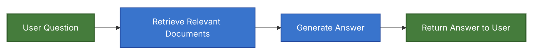 2-Step RAG에서는 검색 단계가 항상 생성 단계 전에 실행됩니다. 이 아키텍처는 간단하고 예측 가능하여 관련 문서 검색이 답변 생성의 명확한 전제 조건인 많은 애플리케이션에 적합합니다.