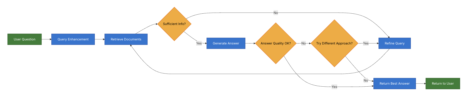 쿼리 향상(Query enhancement): 검색 품질을 향상시키기 위해 입력 질문을 수정합니다. 이는 불명확한 쿼리 재작성, 여러 변형 생성 또는 추가 컨텍스트로 쿼리 확장을 포함할 수 있습니다.