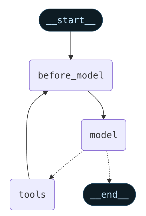 에이전트에서 메시지 기록을 트리밍하려면 @before_model 미들웨어 데코레이터를 사용하세요:
