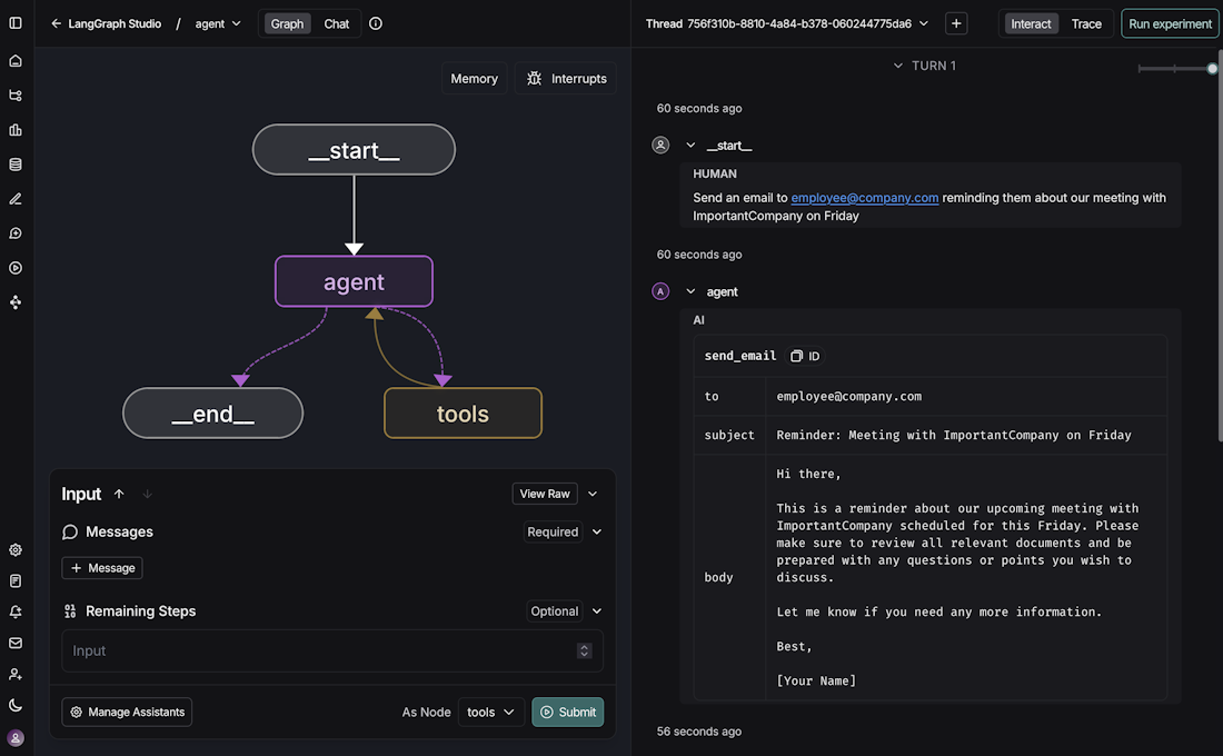 Studio는 에이전트의 각 단계를 쉽게 관찰할 수 있도록 합니다. 모든 입력을 재생하고 정확한 프롬프트, 도구 인수, 반환 값 및 토큰/지연 시간 메트릭을 검사할 수 있습니다. 도구가 예외를 발생시키면 Studio는 주변 상태와 함께 이를 기록하므로 디버깅에 소요되는 시간을 줄일 수 있습니다.