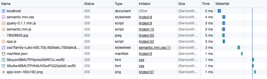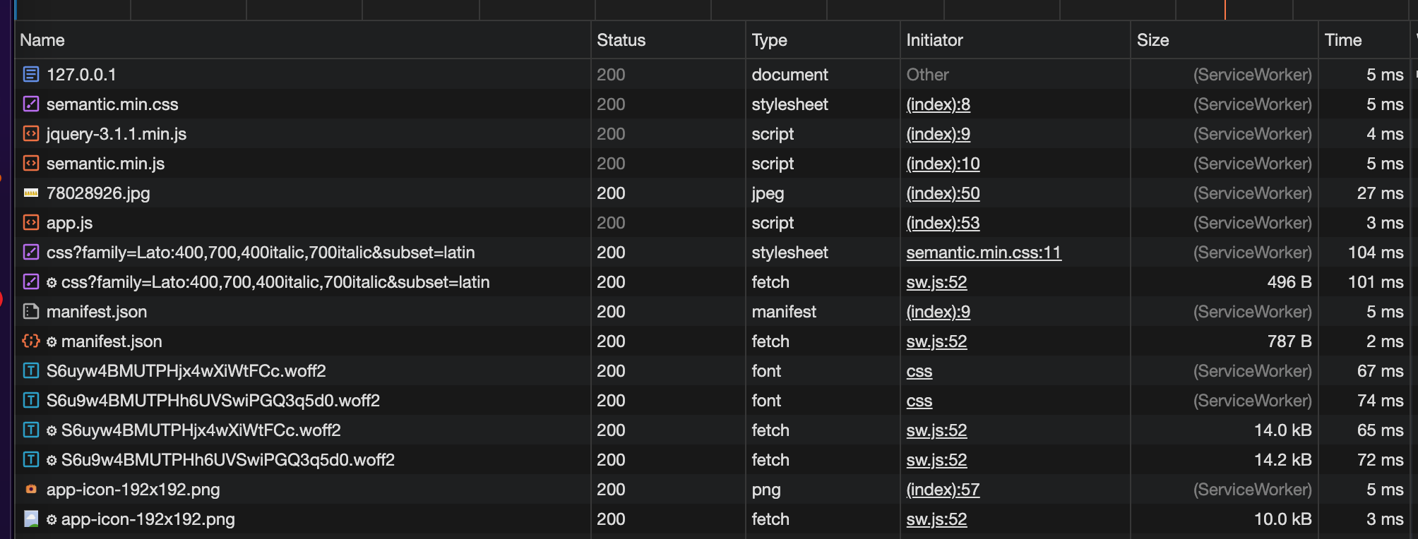 여기서 모든 리소스가 service worker에서 가져오는 것을 확인할 수 있다.