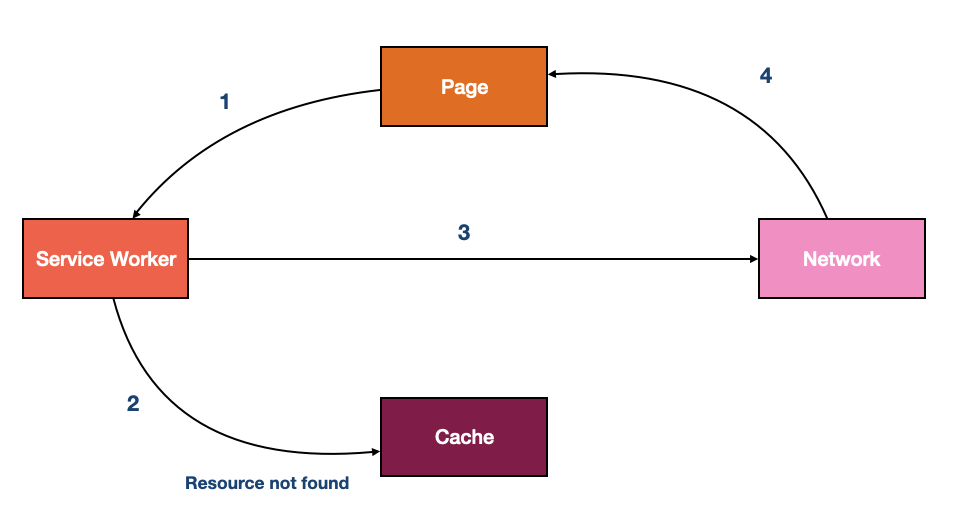 페이지는 service worker에 요청을 보내고 캐시를 조회한다. 캐시에 있다면 리턴하고 없다면 네트워크를 조회해서 리턴한다.