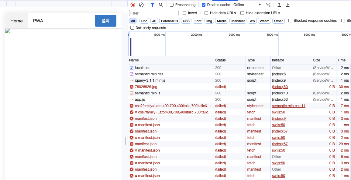 이는 위에서 캐싱한 데이터 외에 나머지 파일 (manifest.json, 이미지 등)은 static 캐싱을 하지 않았기 때문이다. 그래서 다음에 동적 캐싱을 활용해 볼 것이다.