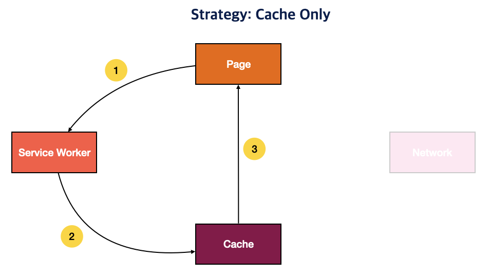 캐시만 사용하는 전략이다. service worker를 요청한 다음 거기에 있는 캐시를 찾아 리턴하는 방식이다. 네트워크 연결은 완전히 무시한다.