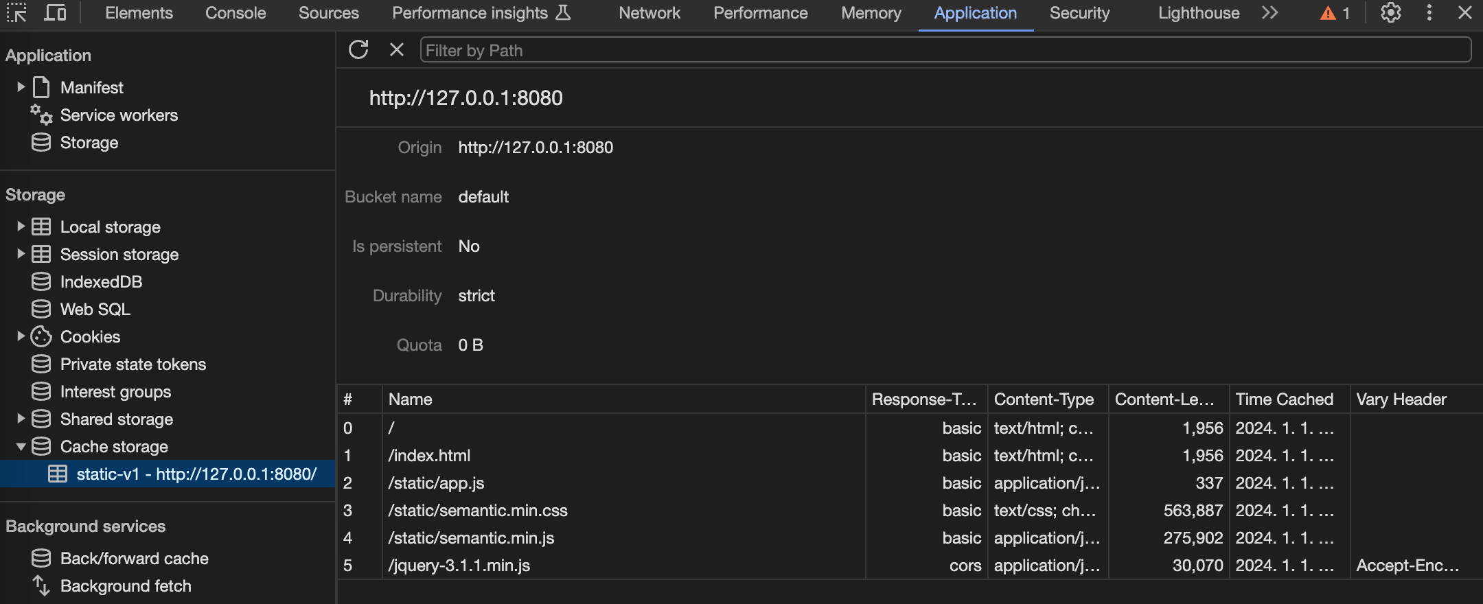 이렇게 추가하고 service worker를 갱신한 다음 개발자 도구를 확인하면 Cache storage에 해당 파일이 들어가 있는 것을 확인할 수 있다.