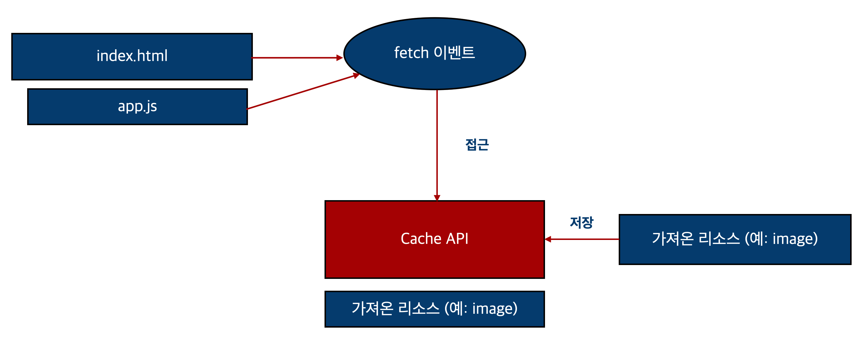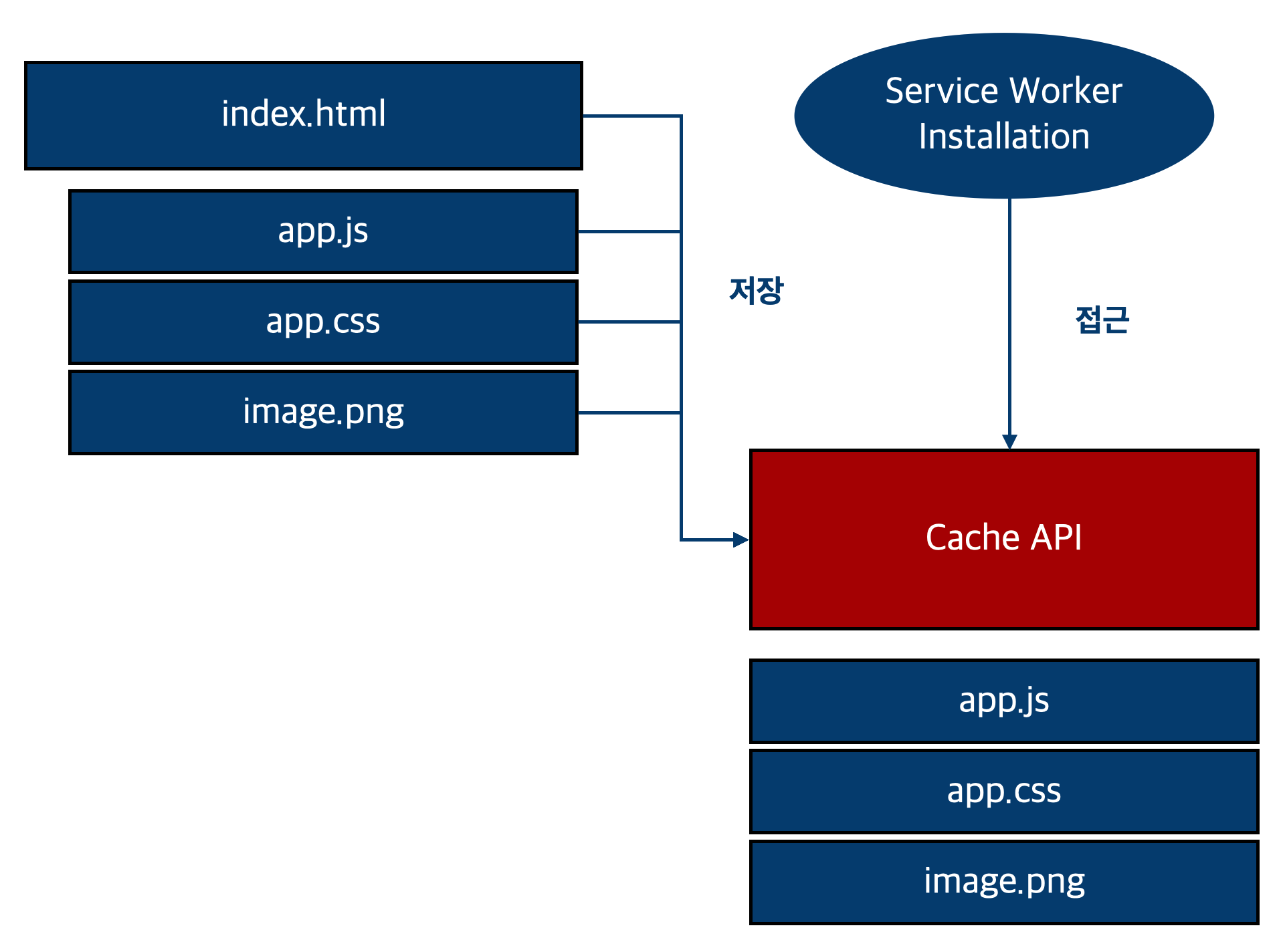 여러가지 javascript, css, image 등의 파일이 있고 이 파일들을 캐싱해야 한다. service worker를 설치할 때 이러한 파일들을 cache API를 활용해서 캐싱한다. 사용자가 접근하여 데이터를 캐싱하고 난 이후 인터넷이 안되는 환경에서 이러한 Cache API를 활용해서 페이지를 표시한다.