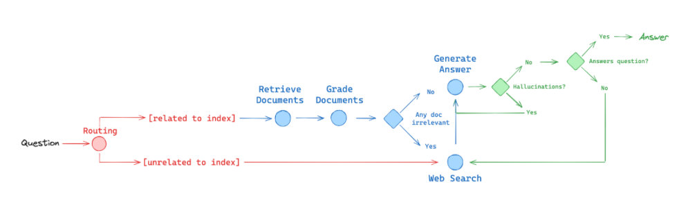 그래프는 논리적 흐름을 신뢰성 있게 표현할 수 있는 훌륭한 방법으로, 아래 그림에서 LangGraph를 사용한 여러 아이디어를 구현했다(빨강 - 라우팅, 파랑 - 폴백, 초록 - 자체 수정):